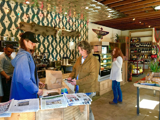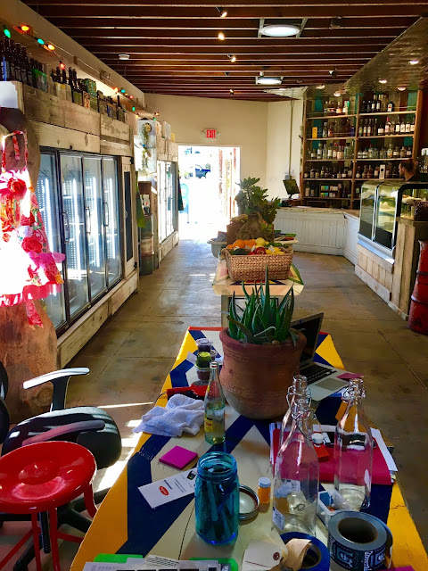 As luck would have it, today is the opening day! I met the owner Michael Stein, a mellow, cool-seeming guy who now divides his time between New Mexico and Venice. Tesuque is the name of the town and Native American reservation near Sante Fe, where the original Tesuque Village Market has been operating since 1989, "Where down home is upscale". When Stein wanted to expand his funky trading post to a new region, he chose Venice specifically for the "Funk factor". I like them already. (*The website link is for their New Mexico location. They don't have a restaurant in Venice. Or a website for it yet).